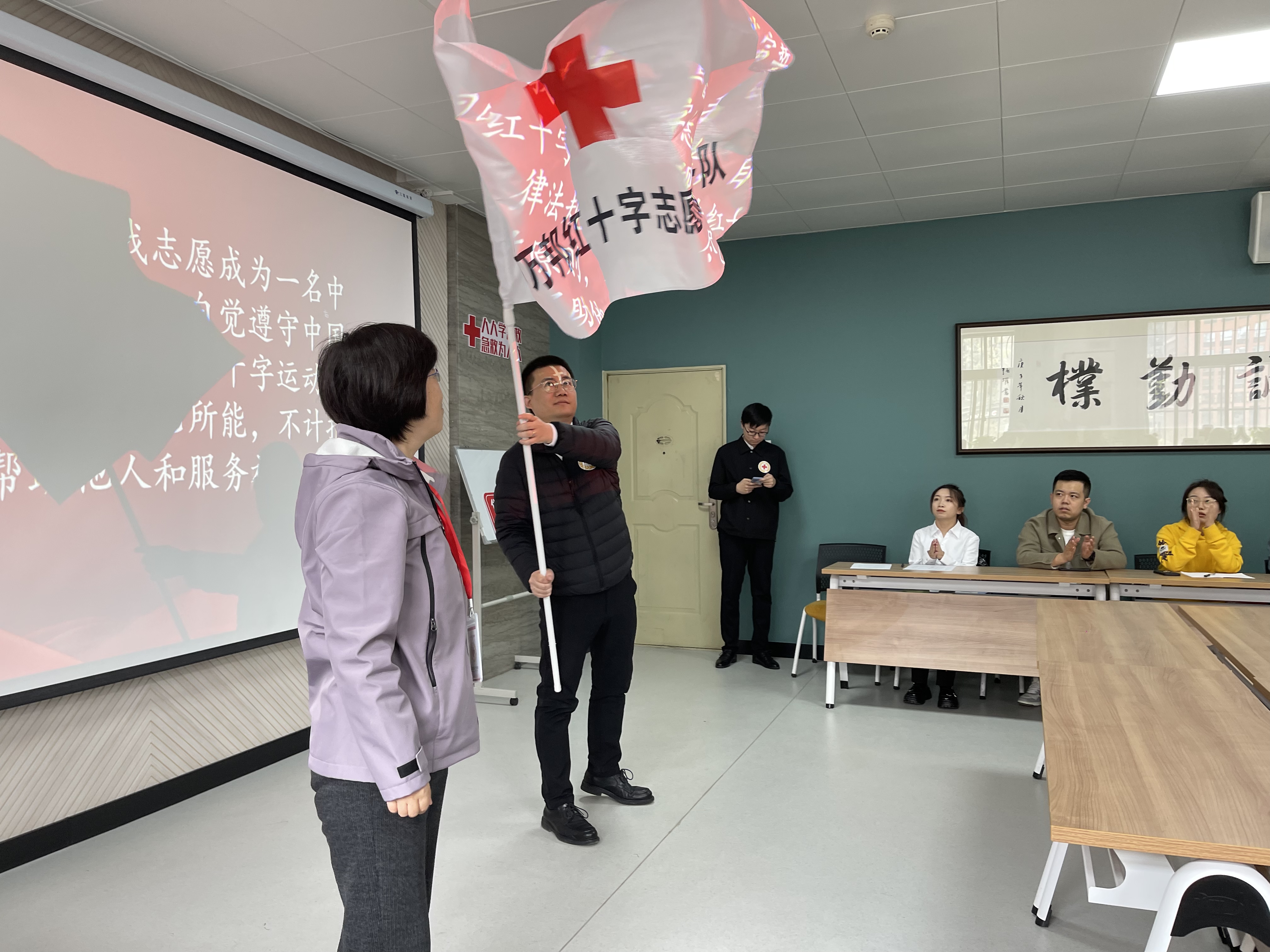 陕西省红十字会一级巡视员关居正代表陕西省红十字会为ballbet贝博martini授牌,ballbet贝博经理叶培哲代表公司接受了授牌;省红十字会组织宣传部副部长校慧敏为陕西万邦红十字志愿服务队授牌授旗。