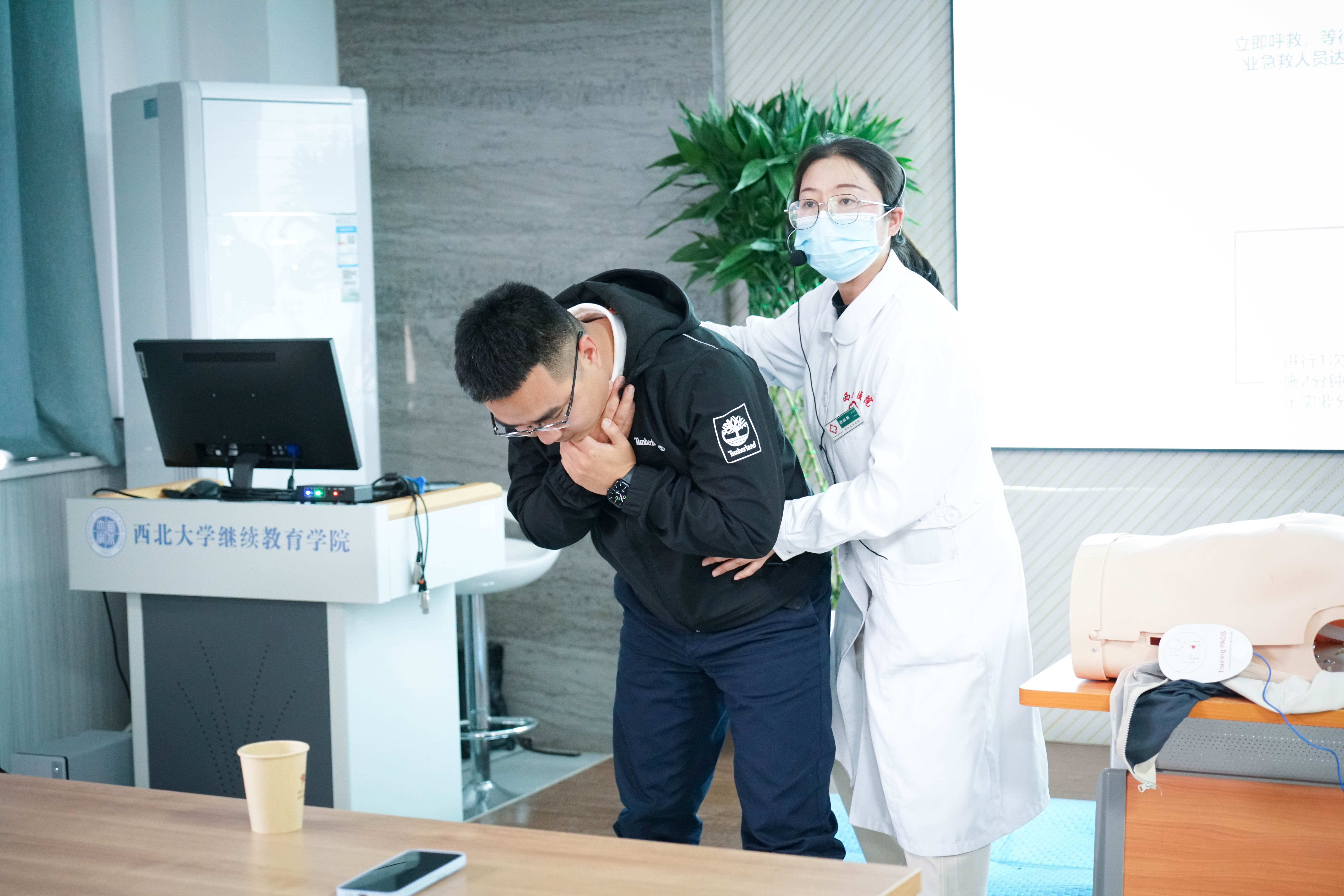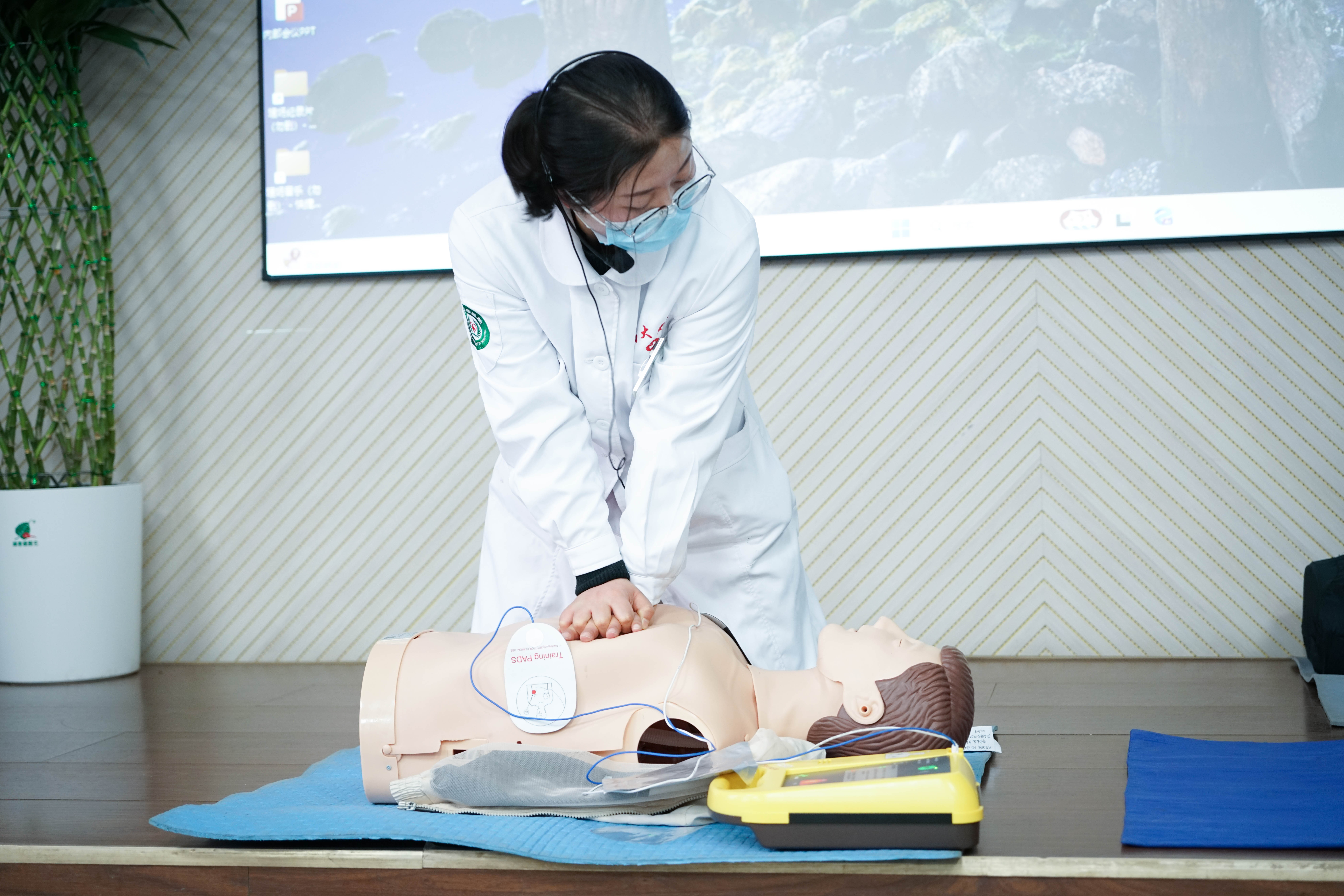 本次应急救护专题培训特邀校医院专业急救团队担任教学指导。三位主讲老师通过详实的数据分析、生动的视频案例以及专业的人体模型实操演示,系统讲解了心肺复苏术(CPR)的技术规范和自动体外除颤器(AED)的操作要领,重点展示了胸外心脏按压的标准手法、气道开放技巧、人工呼吸操作规范及突发状况处置流程,着重强调了"黄金四分钟"急救时效的重要性。在实践环节,参训学员通过分组模拟练习,在老师"手把手"指导下完成了胸外按压深度频率控制、呼吸气囊使用等核心技能的分项训练,老师现场实时纠正操作误区,确保急救动作的规范性和有效性。